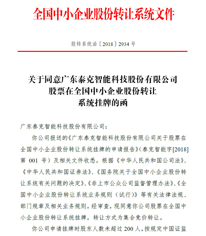 2018年9月13日,广东泰克智能科技股份有限公司在广东精衡粤衡律师事务所专业法律服务的协助下,成功在全国中小企业股份转让系统挂牌公开转让(证券简称:泰克智能,证券代码:873003)。