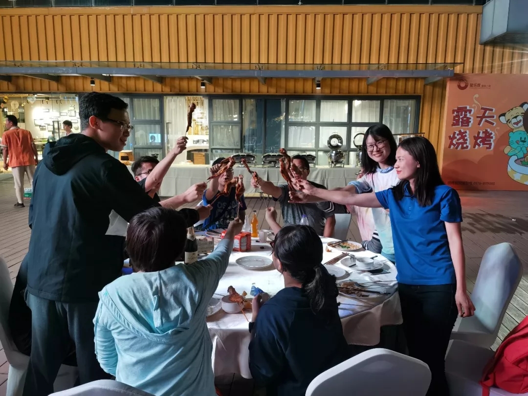 上述五项体力活动结束,接近晚上七点,想着还有美味烧烤等着吃、精彩电影等着看,大家已经是迫不及待了。来到餐厅,大家边吃烧烤、边看电影,举杯畅饮、互相祝福,其乐融融。